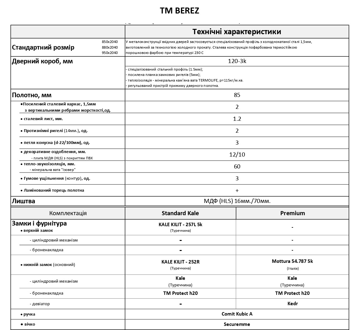 Модели Berez считаются более доступной версией двери Страж среднего класса. .Дверное полотно Berez состоит из специальных стальных профилей в виде каркаса с облицовкой. Материал коробки и полотна – полотно листовой металл 1,2 мм, профильная коробка металл 2мм защищена порошковым покрытием с усиленной термо- и износостойкостью. Внутренние полости дверного полотна и коробки заполнены тепло-звукоизолятором типа Изовер, что обеспечивает максимальный комфорт. Облицовка дверного полотна Берез – МДФ 8 мм, ламинированная пленкой ПВХ с 2-х сторон, имитирующая ценные породы дерева.