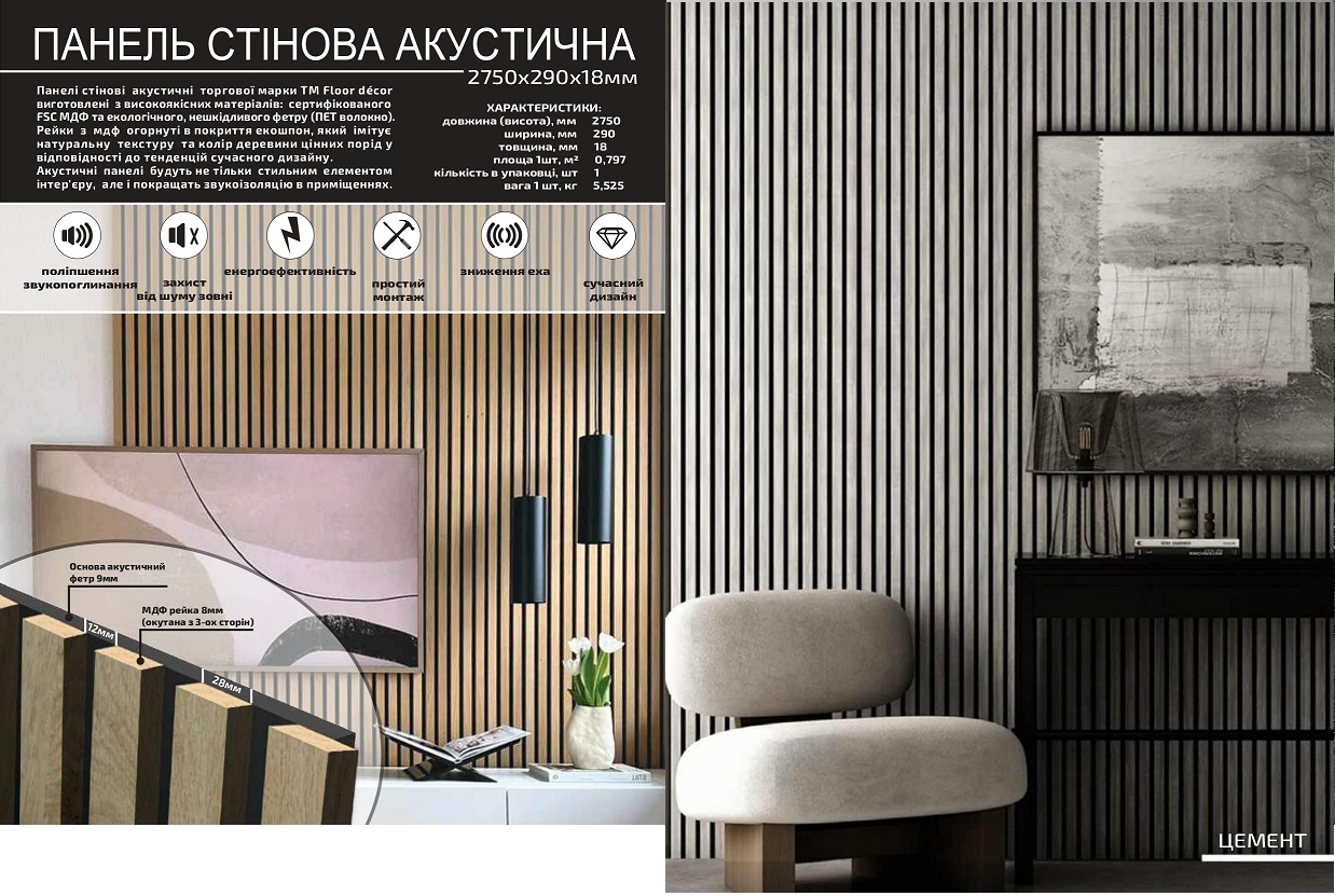 Акустичні стінові панелі виготовлені з сертифікованого FSC МДФ і повсті (пластикової замші), що значно знижує рівень шуму в приміщенні. Панелі можна легко встановити без навчання та досвіду. Вони легко кріпляться шурупами або кріпляться за допомогою клею.