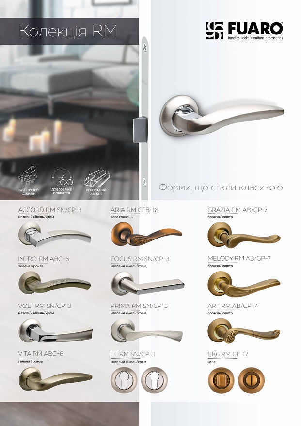 Дверні ручки бренду Fuaro виготовлені зі сплаву металів (цинк, алюміній, магній і мідь) під назвою замак. Завдяки використанню цього матеріалу та сучасних технологій оцинковки інженерам і дизайнерам вдалося досягти найкращого поєднання ціни та якості дверних ручок. - основа ZAMAK надає оригінальну форму і забезпечує її міцність - шар міді забезпечує зчеплення між конструкційним матеріалом ручки і вирівнювальним шаром - шар нікелю вирівнює нерівності і надає додаткову міцність покриттю - тонуючий шар надає ручці колір і текстуру - лакове покриття захищає поверхню від хімічного впливу навколишнього середовища.